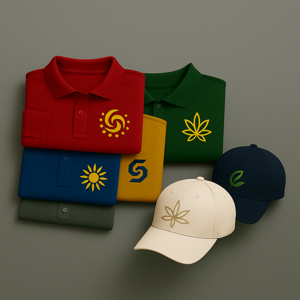 Camisetas polo de várias cores e bonés, para maior conforto e celeridade na busca da solução para sua empresa. Realizamos a produção de LOGO em formato de bordado, na extensão E.M.B. ou D.S.T., para evidenciar, padronizar e assim levar a sua marca nos uniformes dos seus colaboradores e/ou grupos.